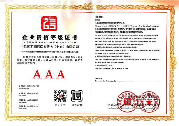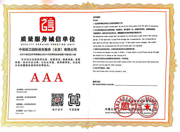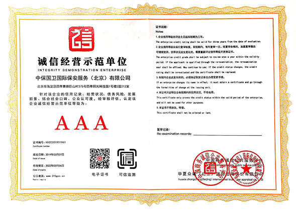 中保國衛(wèi)國際保安服務(北京)有限公司,屬中保國衛(wèi)集團旗下子公司。能全方位的為大型客戶提供優(yōu)質(zhì)的安保、押運服務,是集人防和技防于一體的新型正規(guī)化綜合安保押運服務企業(yè),提供人防、物防、技防、聯(lián)網(wǎng)報*、非武裝押運等安防相關的一站式服務。 公司在國內(nèi)多省設立有分公司及分支機構,著重提升安全押運、智能技術押運及安全技術防范相關的服務,業(yè)務范圍覆蓋全國一、二線城市、港澳地區(qū)以及海外地區(qū)。安保方面主要為政府機構、金融機構、企事業(yè)單位、醫(yī)療衛(wèi)生、高等院校、工業(yè)園區(qū)、大型商場、高檔住宅、智能商務樓、大型活動提供門衛(wèi)、守護、巡邏、押運(非武裝)、安全檢查、保安特勤、私人護衛(wèi)、消防中控、安全技術防范、遠洋護航等全方位服務,同時面向國際市場,為中資企業(yè)在“一帶一路”沿線國家投資提供境外安保服務。 >> 更多內(nèi)容 |